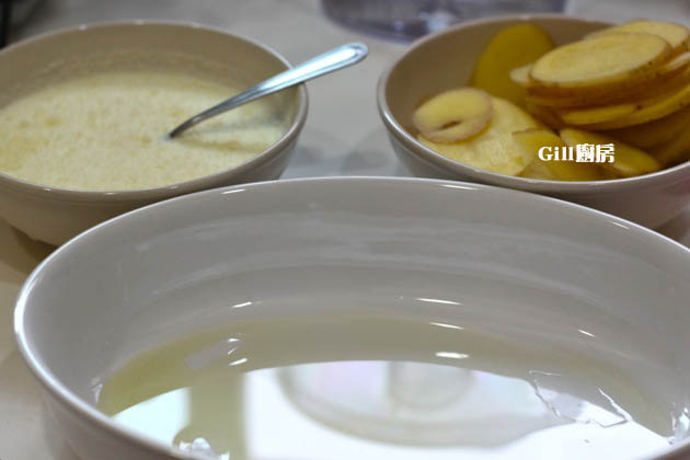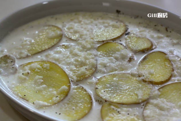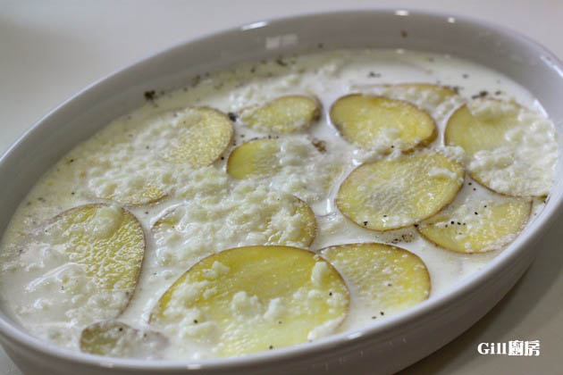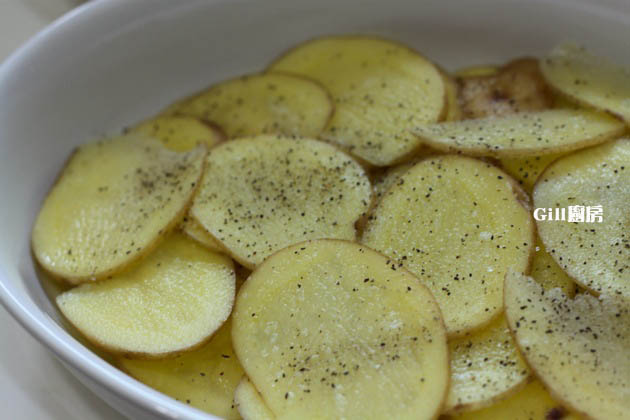 然後就慢慢的開始堆疊馬鈴薯,每鋪好一層馬鈴薯就灑上少許鹽巴跟胡椒粉,之後再把剛剛調好的牛奶給倒進去
