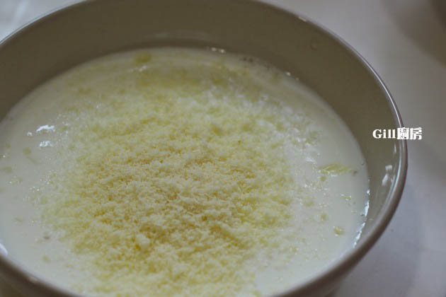 因為家裡的鮮奶油用完了,只好窮則變、變則通,把怕馬森起司粉倒了進去,然後再加入切碎的蒜頭,攪一攪