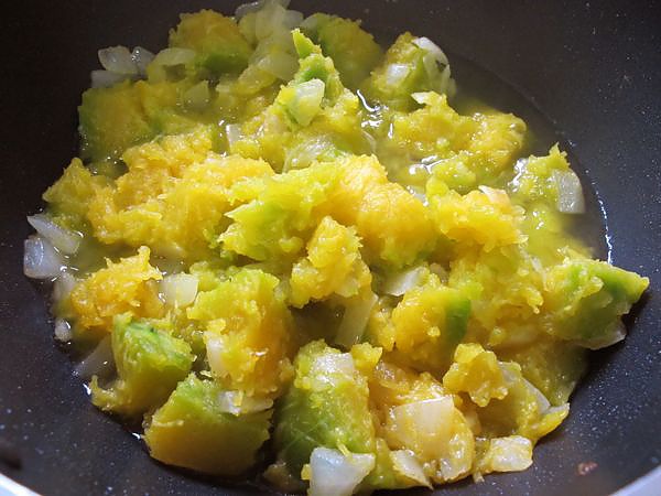 所以很有耐心的仔細的將洋蔥炒軟、炒透,之後再將蒸熟的南瓜加進來一起拌炒