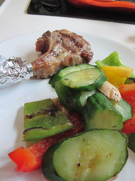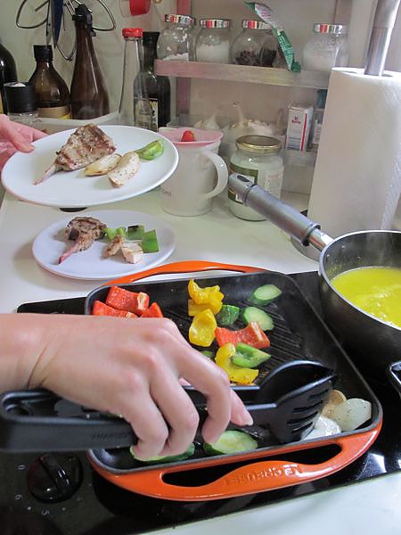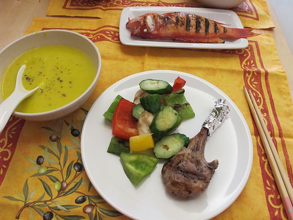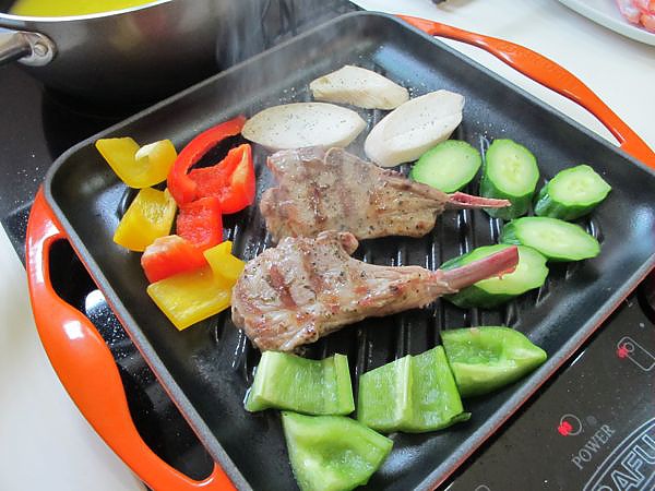 (其實在醃羊排的時間裡,除了切洗蔬菜跟處理魚之外,還把南瓜切塊放入電鍋裡去蒸煮,時間很夠用!)
