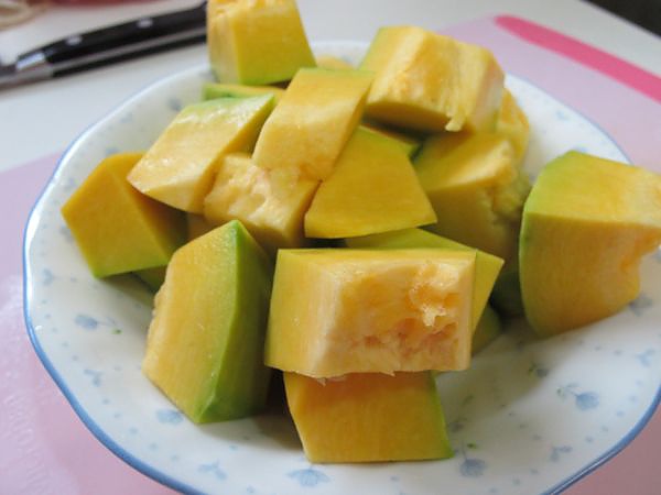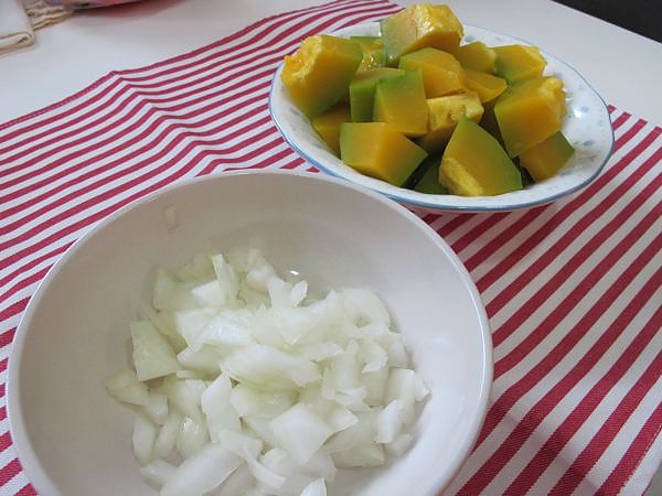 我用半顆南瓜切塊後,送進電鍋去蒸一下,然後把洋蔥切小丁
